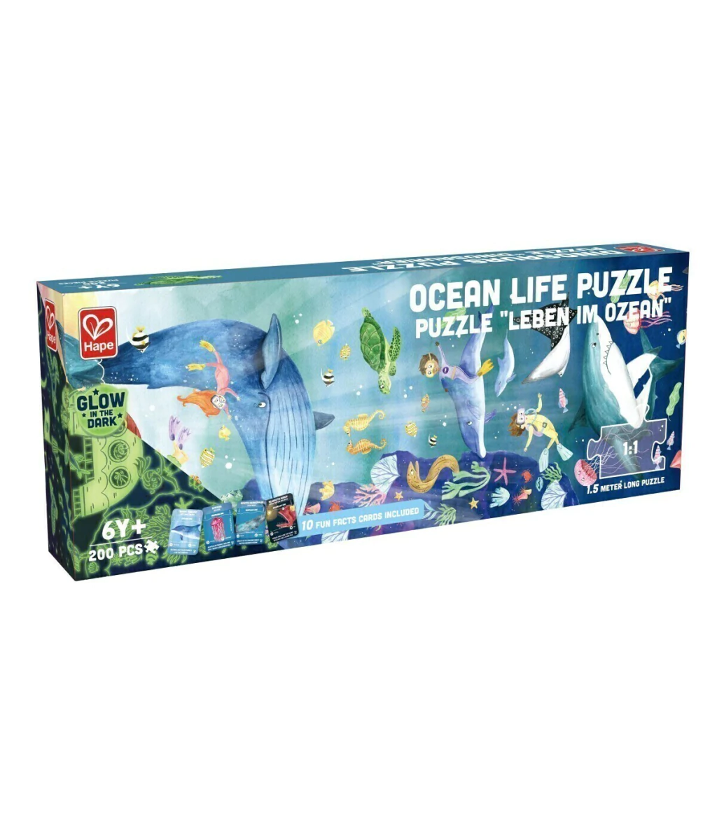 Visitá la deslumbrante vida marina con este hermoso rompecabezas de suelo de 210 piezas y 1.5 metros de largo. Apagá las luces y mirá cómo las piezas brillan en la oscuridad. Incluye 10 tarjetas con datos divertidos sobre animales marinos.